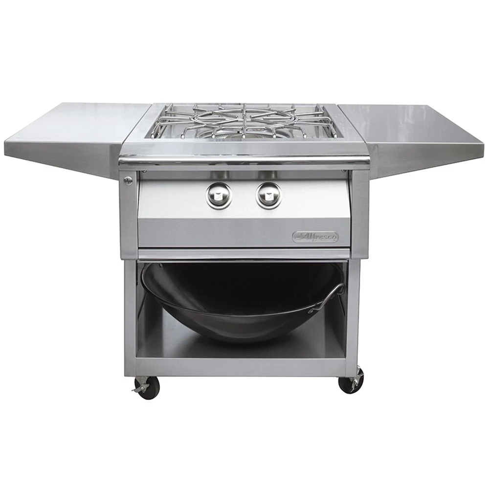 Alfresco AXEVP-CART Versapower Cooker on Cart, 48-Inch offers a powerhouse burner system, making it the perfect complementary appliance to complete your outdoor kitchen. This versatile double burner offers 400 to 65,000 BTUs of power for total heat control. The unique heavy-duty spider grate has a removable trivet and can handle a range of cookware, from small saucepans to a 100 quart stock pot. There are numerous ways to cook; use the center brass burner to simmer delicate sauces at a low 400 BTU or remove the center ring grate and drop in a commercial wok. The integrated cart offers smart side shelves for prep space and a bottom shelf large enough to hold a commercial wok