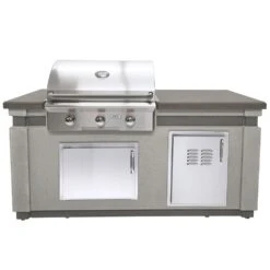American Outdoor Grill T-Series Outdoor Kitchen Island with 30NBT-00SP Built-In Grill, Natural Gas provides a robust, complete grill island that’s sure to enhance your outdoor kitchen paradise. With a glass fiber reinforced concrete base and polished smoke countertop, the AOG island comes complete with a 30-inch built-in grill that boasts premium 304 stainless steel construction throughout including the burners, flame tamers, Diamond Sear cooking grids and the warming rack. The double-layered, satin finish oven hood comes welded to create a seamless grilltop that’s as sleek as it is durable. With 3 heavy duty U-shaped burners that offer a 45,000 BTU capability over a 540 square inch primary grilling area, this unit is sure to please hungry groups of any size. The easily visible analog thermometer comes mounted on your grill hood and can read temperatures up to 1000 degrees F while the funneled grease collection technology with the 10-inch stainless steel drip tray makes for a super easy clean up after everyone is full. The BBQ island is finished off with convenient built-in doors to give your outdoor kitchen increased storage and help create a cooking station that’s easy to use.