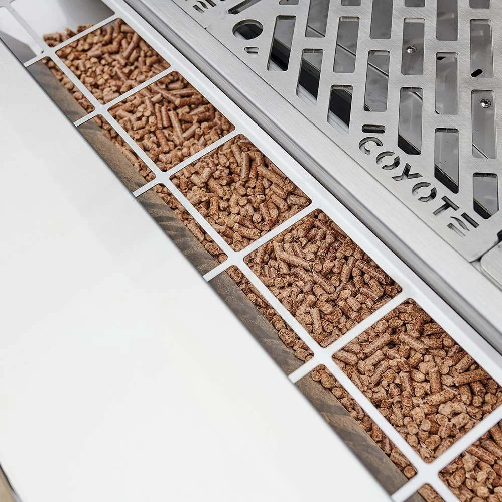 Coyote Stainless Steel Built-In Pellet Grill, 36-Inch (C1P36) provides a premium pellet grill option for your outdoor kitchen. Designed with ease-of-use in mind, this pellet grill takes the guesswork out of grilling with an intuitive digital touch display, Smart Drop pellet feed and three included temperature probes, so you’ll always know the conditions inside your grill. This grill features a temperature range of 175 degrees to 700 degrees Fahrenheit and features a 17-pound hopper capacity to allow for low-and-slow cooking, high temperature grilling and everything in between. A front-loading pellet hopper and spring assist hood make the grill even easier to use, while the Versa-Rack cooking system allows for cooking on multiple surfaces for greater cooking capacity. Additional user-friendly features include interior lighting, a temperature probe LED and an electronic power ignition.