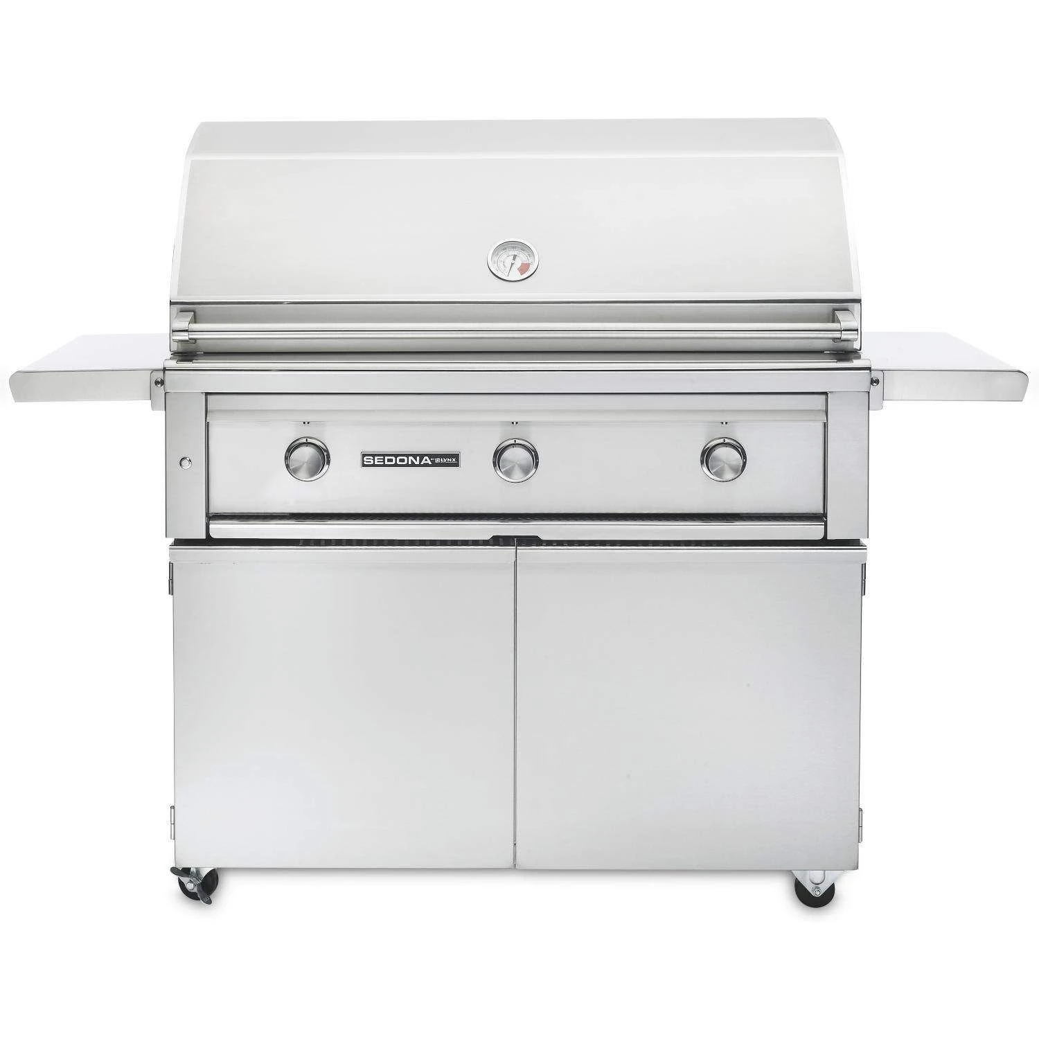 Sedona By Lynx L600F 36-Inch Gas Grill On Cart provides a superior blend of innovative features and professional craftsmanship to create one of the most advanced grills on the market. This BBQ grill features a heavy 201 stainless steel construction with smooth welded joints and polished mirrored edges for a blend of style and durability that will stand up to the elements in any climate. Designed for professional-style performance, the grill features heavy duty stainless steel tube burners to provide extreme high heat across the grilling surface. The traditional tube burners sit below a rack of ceramic radiant briquettes to provide a charcoal-like infrared heat for an enhanced gas grilling experience that’s evenly distributed across the grill surface. With LED backlit control knobs, internal halogen grill lights, an optional rotisserie system with infrared rear burner, and a spark ignition, this unit combines all of the requisite features of a high-end grill and then some – so you can create the best barbecue.