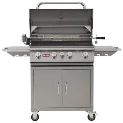 The 32-inch Sizzler also features a unique Flame Thrower Ignition that shoots a burst of flame to ignite the main burners and is much more reliable than traditional spark ignition systems. The insulated and double lined hood keeps hot air in to ensure a consistent grilling environment complete with a built in 3-inch temperature gauge to accurately monitor your grilling temperature. In addition, the 15,000 BTU infrared back burner offers a high quality rotisserie burner for professional style rotisserie cooking. The stainless steel grill cart features double door storage, fixed shelves, and high quality locking casters to provide a terrific stand alone grill option.