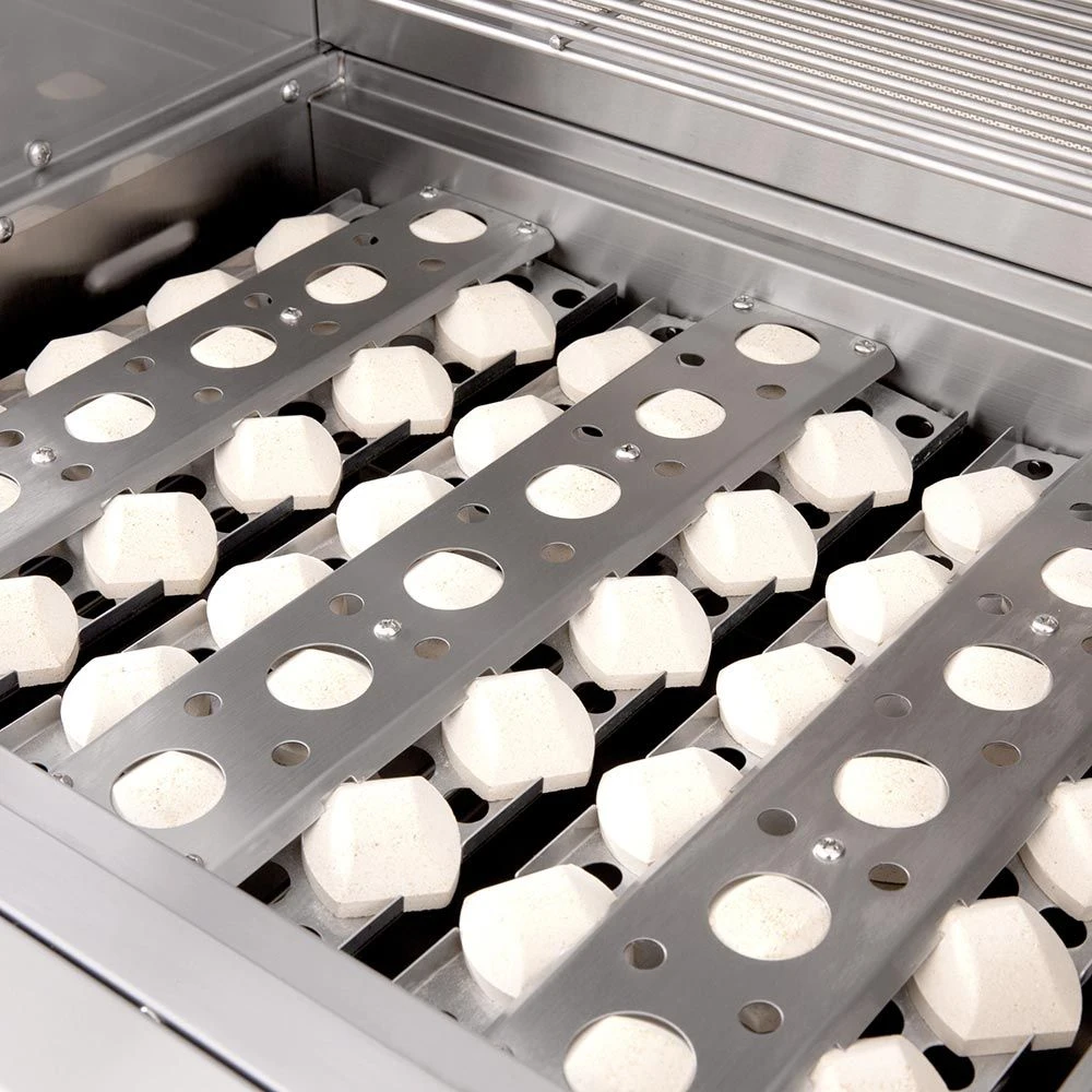 - Captured Briquette Trays – Unique ceramic briquettes sit above the burner to provide radiant heat and eliminate hot/cold zones across the 740in² cooking surface