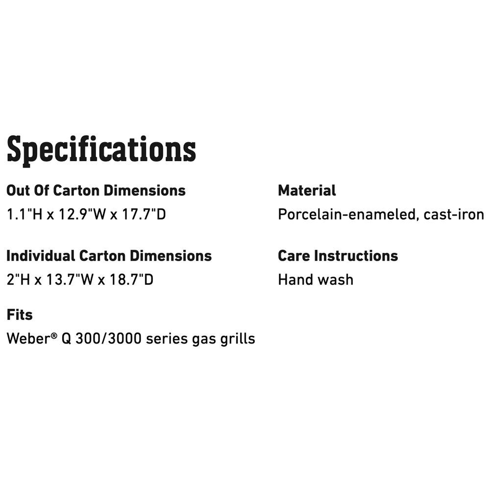 Weber Griddle for Q 300/3000 Series Grills (WEB-6506) provides a smart upgrade for your Weber grill, bringing the power of perfect pancakes and excellent eggs right to your own backyard. Durable cast iron construction provides even heating for consistent results every time.